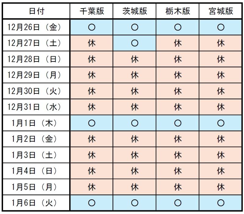 2025年12月26日~2026年1月6日までの新聞発行スケジュールは下記の通りです。(○印が発行日) 1月6日以降は通常発行となります。